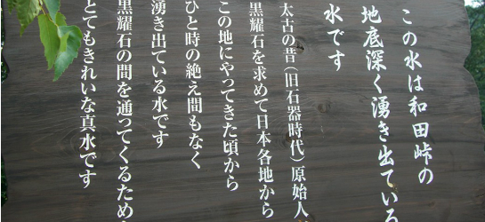 「黒耀の水」は、この地域が黒耀石産地であることに因んで名付けられたもので、今も和田峠周辺の森から湧き出す水は、黒耀石の岩盤で濾過された名水(和田峠の黒耀水)といわれ、遠方からも多くの方がその天然ミネラル水を求めて訪れています。黒耀石に殺菌作用やおいしい水を作り出す力があることは昔からいわれきました。