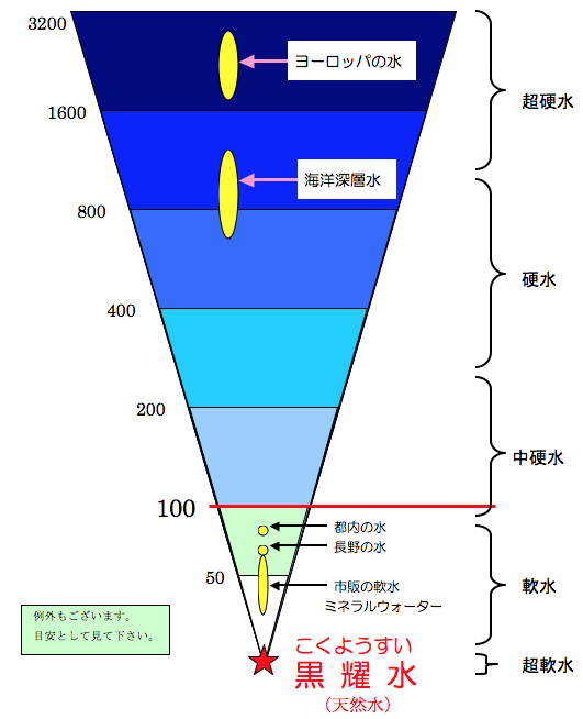 地元では和田峠の黒耀水は、超軟水、腐らない水といわれています。この石のもつ微弱エネルギー、遠赤外線、磁力線によって濾過された水は、分子の集合体を小さくしミネラル分の大変少ない全硬度0.95という「日本一の超軟水」となります。素材の香りや味をしっかりと引き出すのが、この黒耀の水の特徴です。